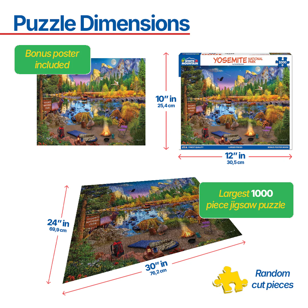 1785pz Yosemite. Animals gather at the river at dusk. Deer, elk, bear, and more can be found at the local watering hole drinking or hunting for their next meal. A camp site is set up off to the side with a fire blazing to keep the occupant warm. A squirrel and chipmunk get close while a coyote hides in the brush nearby, curiously watching what the visitor is doing. Artist David Maclean offers a majestical view of one of California’s national parks in this 1000 piece jigsaw puzzle. Finished size 24" x 30".