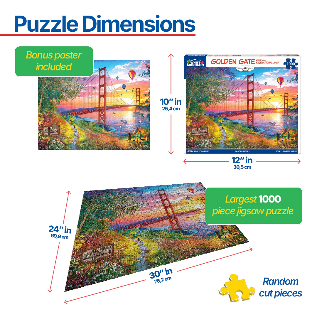 1788pz Golden Gate. Take a path that leads to the San Francisco Bay and watch the sail boats glide by or have a picnic while you look up to the sky and watch the hot air balloons float by. The day is coming to an end but the setting sun only adds to the beauty that surrounds the Golden Gate Bridge. Designer Dominic Davison offers a spectacular rendition of the iconic bridge in this 1000 piece jigsaw puzzle. Finished size 24" x 30".