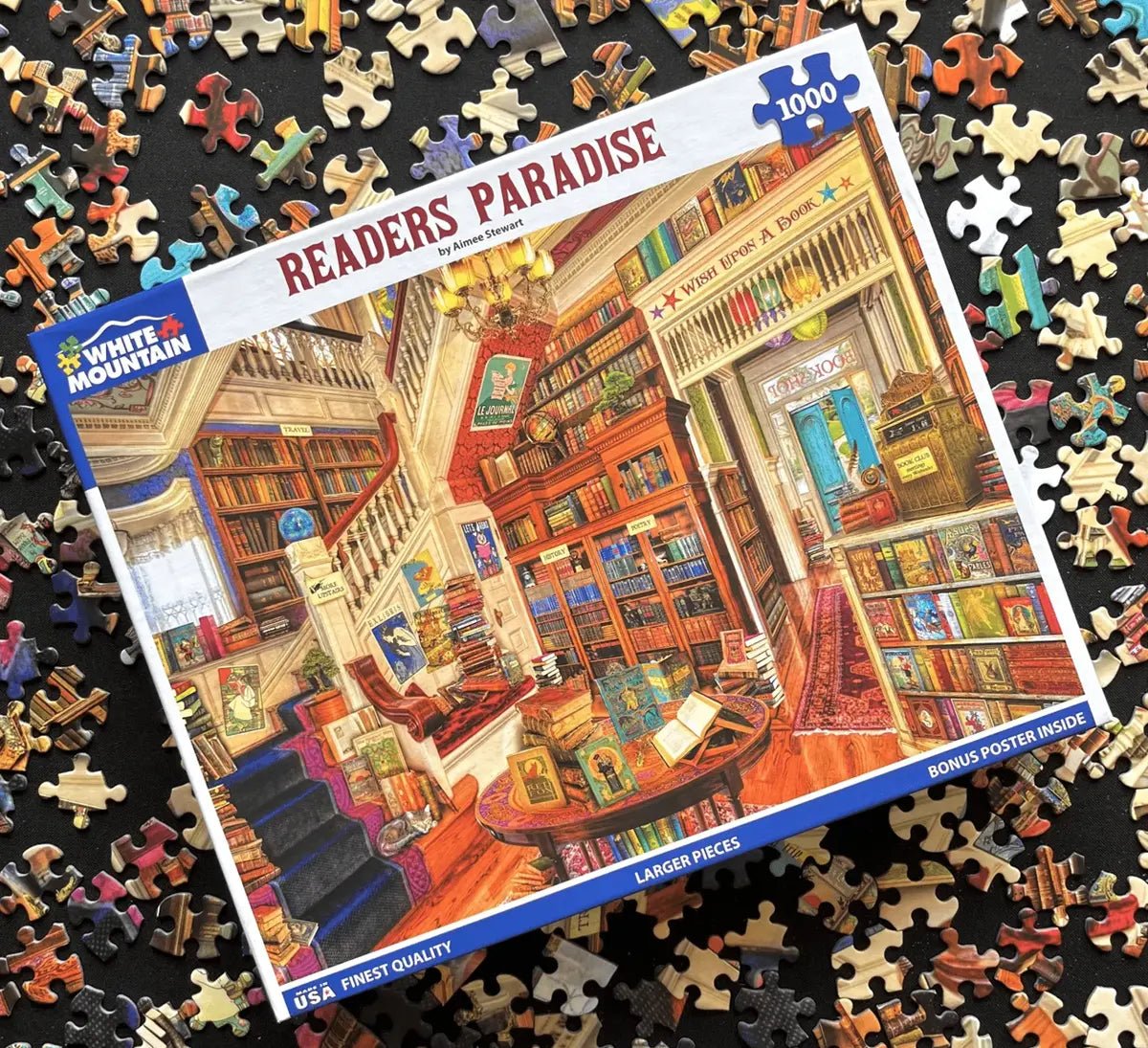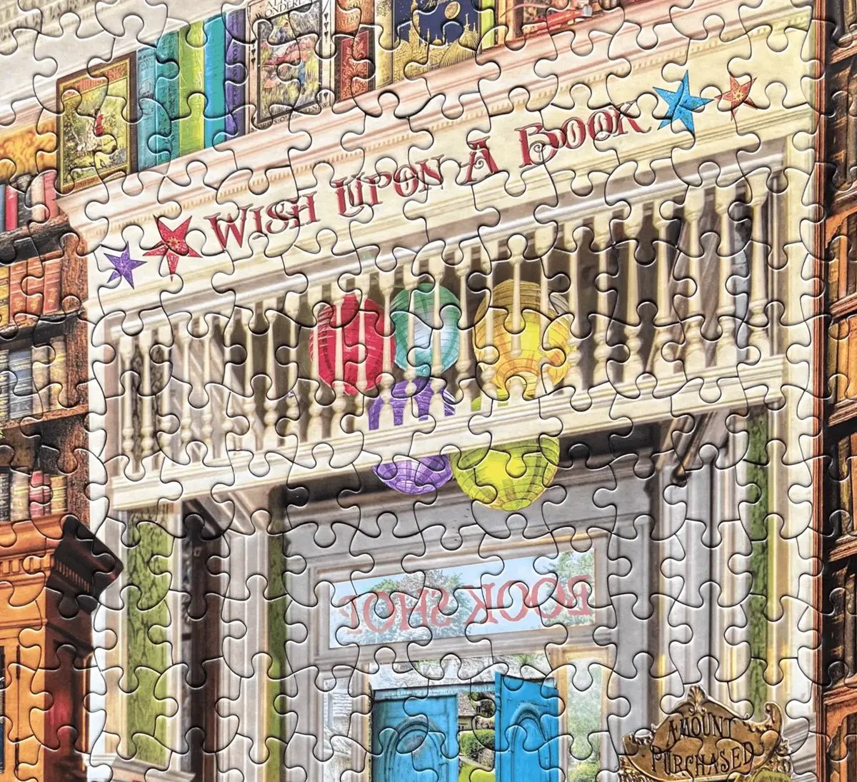 1244 Readers Paradise. The amount of detail in this painting is astonishing! You'll be immediately drawn into this magical shop with stacks of tomes offering the classics, history, poetry, travel and much more. Find a cozy nook to settle into upstairs or downstairs and "wish upon a book". If you're lucky, the resident kitty might curl up on your lap. . 1,000 pieces. Finished size 24" x 30".